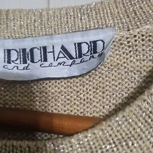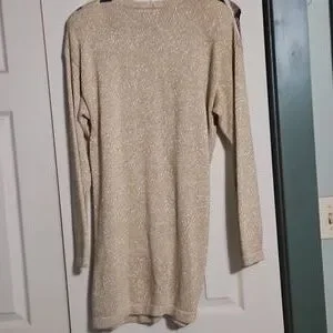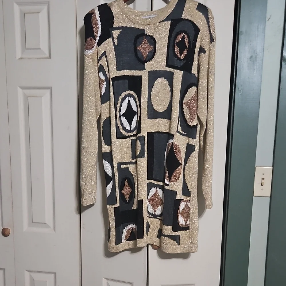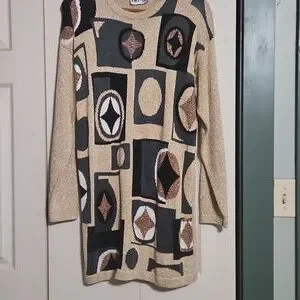 Stylish sweater dress with geometric patterns. Features black, gold, and brown colors.