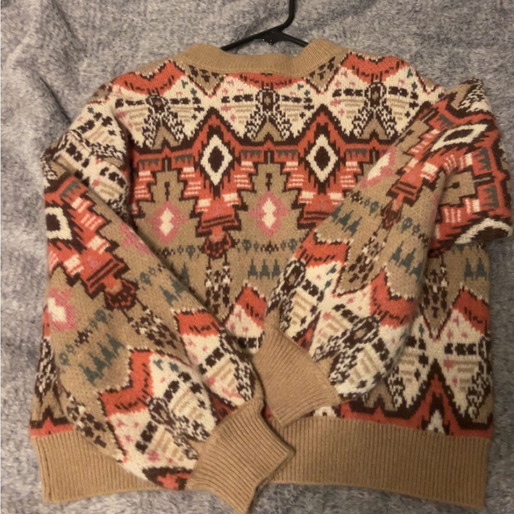 Stay cozy and stylish with this multicolor geometric patterned sweater. Perfect for adding a pop of color to your wardrobe.