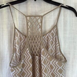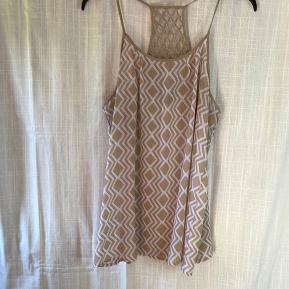 Elevate your style with this chic geometric patterned top. The tan color adds a touch of elegance to any outfit. Perfect for casual or dressy occasions.