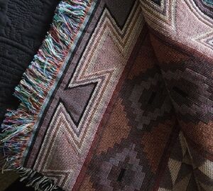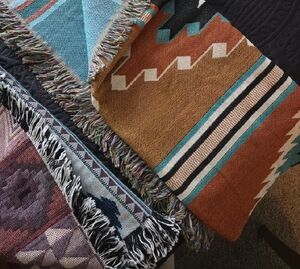 Enhance your home decor with this set of Western Aztec patterned throw blankets. Featuring a blend of vibrant blue, brown, and cream colors, these blankets add a touch of style and warmth to any room.