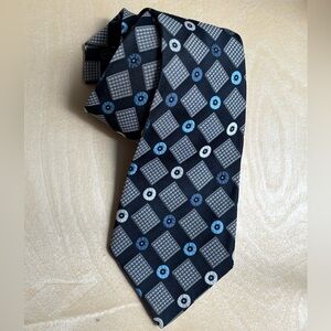 Stylish tie with geometric patterns in blue and gray. Perfect for formal occasions.