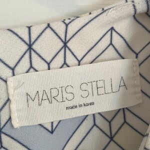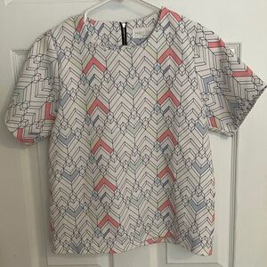 Stylish top with a geometric pattern. Features red, blue, and white colors.
