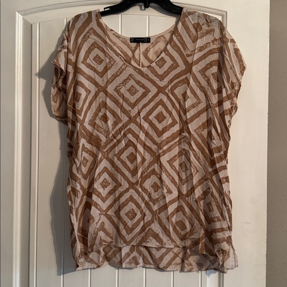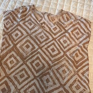 Stylish top with a geometric pattern. Features a blend of brown and cream colors.