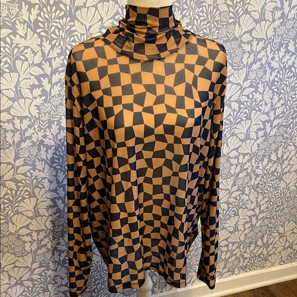Stylish mesh turtleneck top with a geometric pattern in brown and navy. Form fitting but very comfortable. Cat friendly home but freshly laundered 😺 smoke free!