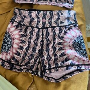 Stylish two-piece set with a geometric pattern. Features a mix of pink, navy, and white colors.