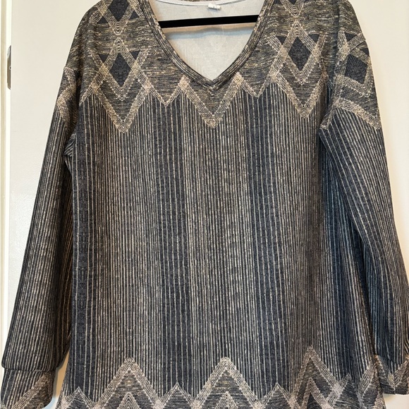 Stylish V-neck sweater with a geometric pattern. Features a mix of gray and cream colors.