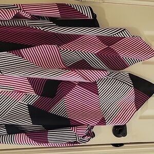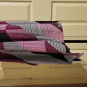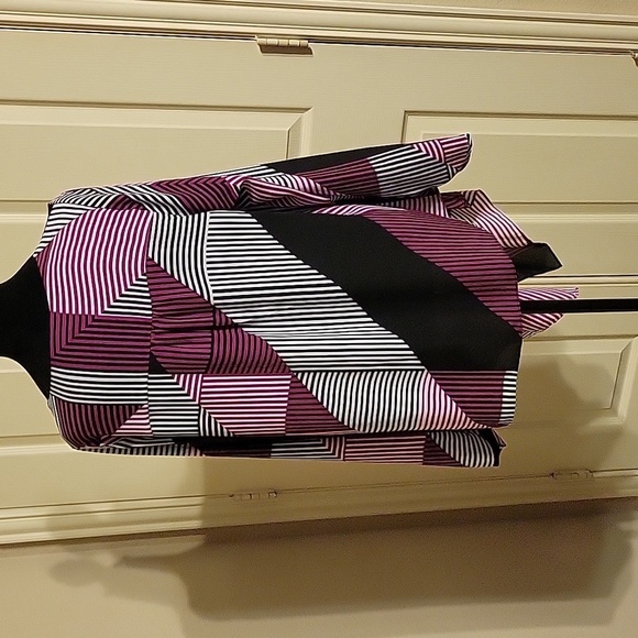Stylish women's blouse featuring a bold white, black, and dark pink/purple geometric pattern. Perfect for adding a pop of color to your wardrobe. Top is light weight material. Can be layered with a tank or cami underneath. Hankerchief hem line in front. Very gently worn and in excellent condition!