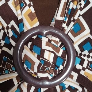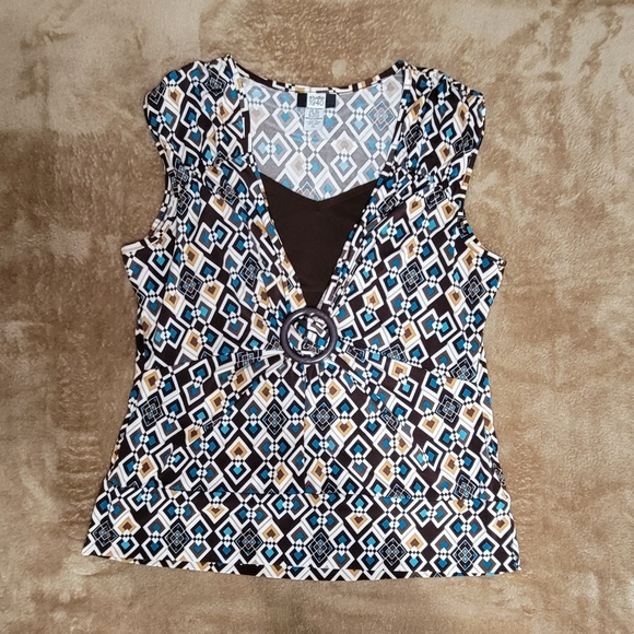 Stylish women's top featuring a geometric pattern in black, blue, and brown. Perfect for casual outings or a day at the office. Layers well. The medallion is plastic not metal. No rips or stains. Comes from a smoke free home.