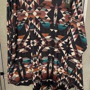 Crazy Train women's top featuring a geometric pattern in black, brown, and teal. Perfect for casual outings. Never worn
