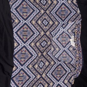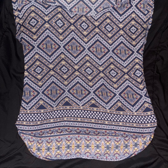 Stylish women's top featuring a geometric pattern in blue and white. Perfect for casual outings or a day at the office.