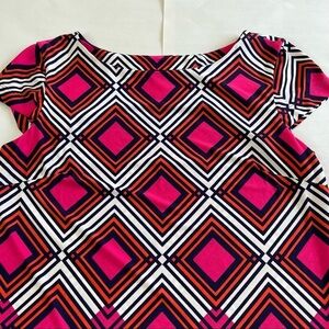 This stylish geometric dress features vibrant pink and blue patterns, perfect for any occasion. The comfortable fit and eye-catching design make it a must-have addition to your wardrobe.