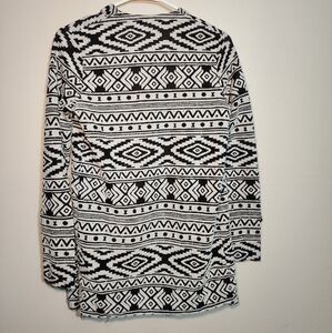 Keywords: cardigan, geometric print, open front, duster cardigan, long sleeve cardigan, black and white cardigan, lightweight cardigan, sweater cardigan, womens cardigan, casual cardigan, boho cardigan, tribal print, aztec print