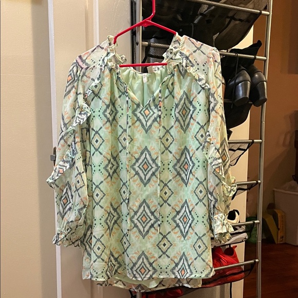 Add a touch of elegance with this geometric print blouse featuring stylish ruffle sleeves. Ideal for any occasion. Only would like 5.00 for it