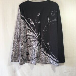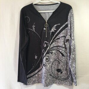 Geometric Print Zip-up Long Sleeve T-shirt, 95% Polyester, 5% Spandex, stretchy, long Sleeve, zip up v-neck. machine washable. Silvery grey and black. Very good condition.