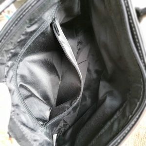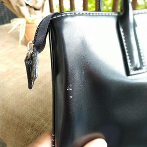 Geometric red, beige, and black with white stitching. pre-owned.
