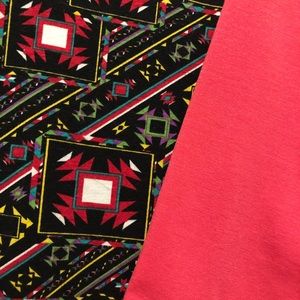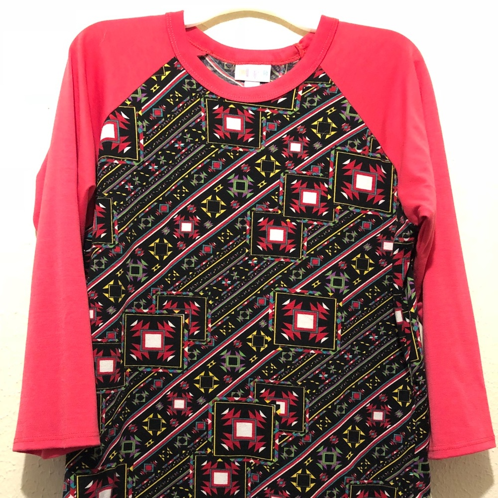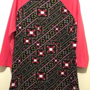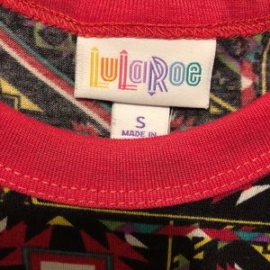 Super fun geometric printed Randy tee by lularoe. Hot pink sleeves and neckline ringer adorn the solid black background covered in vibrant shapes. Worn once and washed per lularoe guidelines. Excellent condition.