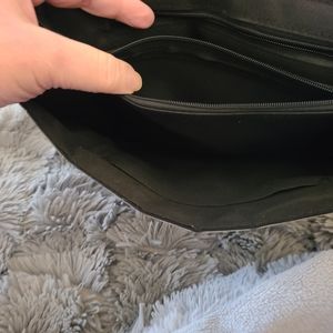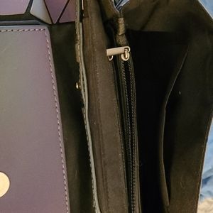 This bag is gorgeous! I have the bigger version and it gets tons of compliments. As you can see, when the light hits it, it's amazing!! Never used this one; too small for my needs. I no longer have the strap for it. Has 2 zippered pockets, 1 open pocket in front & a couple of sections inside bag. Cleans up easily as well.
