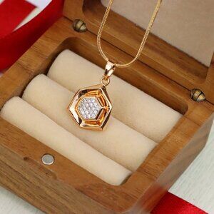 A modern geometric pendant featuring a hexagonal crystal center set in a bold rose gold frame, combining structure with sparkle.