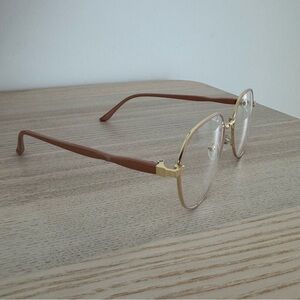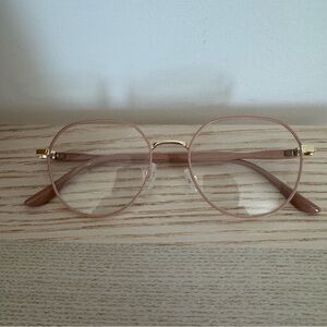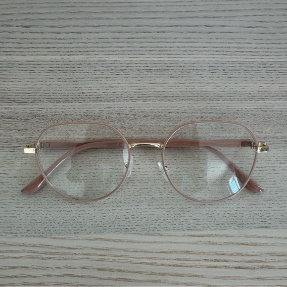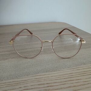 Elegant round glasses with pink frames and gold accents. Geometric Rose-Gold frames featuring a stylish metal design