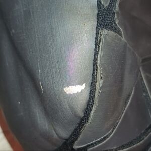 Stylish geometric backpack with slanted triangles and a matte finish in a dark gray. Features adjustable straps, drawstring, and buckle closure with interior pockets. Shows some signs of wear and use.