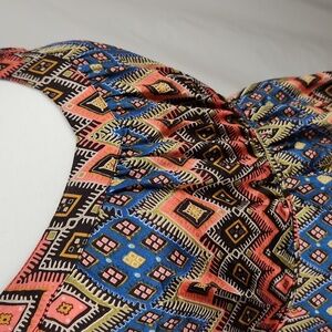 Embrace the casual resort vibe with this sundress, featuring a vibrant geometric print. The sleeveless design with a scoop neckline and mini length makes it perfect for warm weather outings. Its lightweight rayon fabric and tie waist ensure comfort and style all day long.