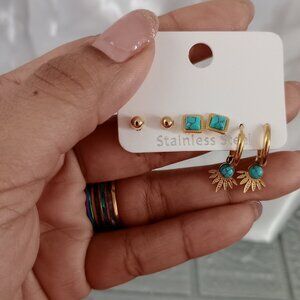 This set includes two pairs of chic, minimal geometric stainless steel stud earrings (each accented with a blue fashion stone) plus one pair of dainty hoops for effortless everyday styling. Hypoallergenic, tarnish-resistant, and lightweight for comfortable all-day wear; perfect for mixing, matching, stacking, or gifting.