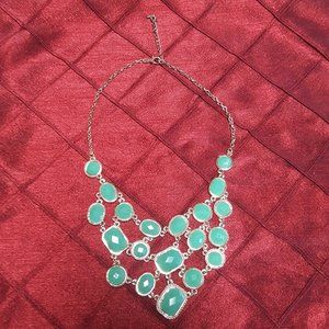 Just in time for Spring! A lovely piece featuring bright green faceted stones in a geometric offset pattern. 8 3/4 from clasp to bottom stone.