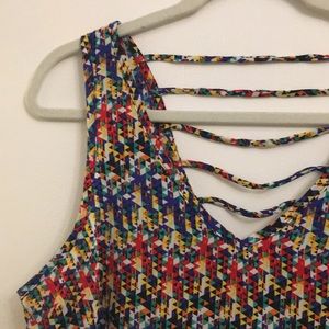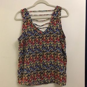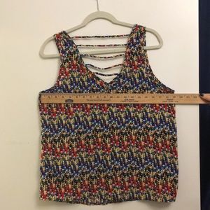 Super fun blouse that works for work and casual wear. Traditional v-neck in the front, strappy party in the back. Says hand wash but tbh I alway tossed it in the machine on delicate. This garment does not stretch and will compress your boobs if you’re a 38C.