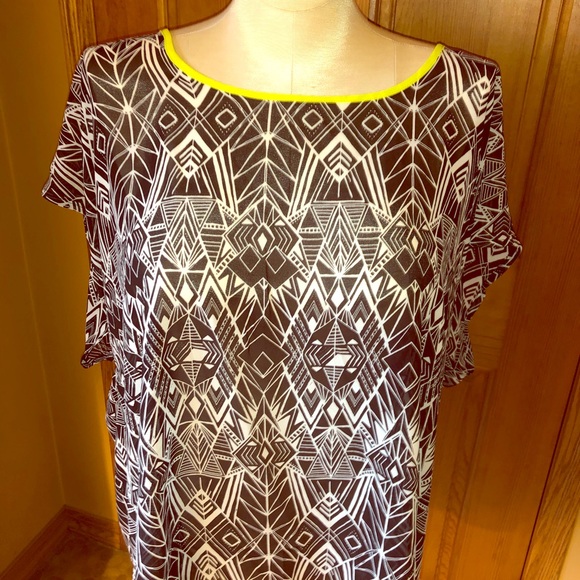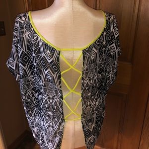 Great top that is semi sheer. Back has awesome cross detail that is open. Fabulous with a cami or bra underneath