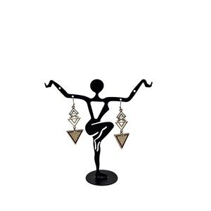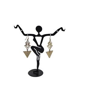 Make a bold statement with these geometric triangle dangle earrings in a luxurious gold color. The stylish dangle/drop design adds a touch of modern elegance to any outfit. These earrings are a perfect accessory for adding a pop of sophistication to your look.