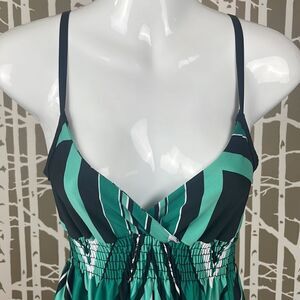 Geometric Tropical Floral Print Maxi Dress. Features allover bright geometric and tropical hibiscus print that is very reminiscent of Clover Canyon's prints, crossover V-Neck top, adjustable straps, smocked empire waistband. The fabric is a thick 95% polyester 5% spandex blend and it drapes without being clingy. In gently worn and laundered condition it has no flaws but does have a tiny bit of pilling around the top (see last 2 pics). I am 5'3" and this is too long on me with flat shoes so, unless you wear a higher wedge or heel, this would be best suited for someone 5'6" or taller (see pics for measurements to verify before purchasing). Very comfortable and striking dress and these graphic prints are so IN right now!