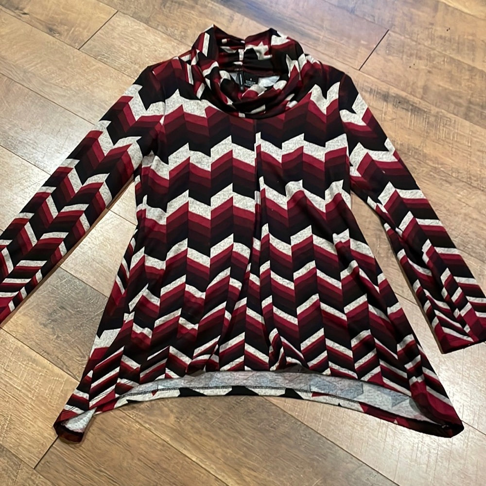Asymmetrical tunic with loose collar. It’s gray, black, purple, and pink.