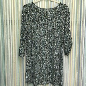 Turquoise, lime green, white and navy patterned. Rayon with some Lycra spandex. Hits mid thigh with longer back.