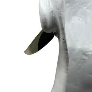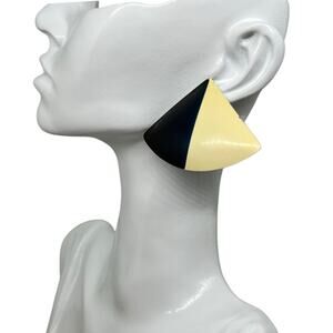 Elevate your jewelry collection with this bold geometric cone-shaped earring featuring a striking two-tone design in cream and navy blue. This statement piece showcases a sleek, modern aesthetic with a glossy finish that catches the light beautifully. The earring features a small metal post for secure attachment. Currently offered as a single earring (no mate included), this versatile piece could be worn as a standalone statement or repurposed in a creative jewelry project. The piece has a contemporary, architectural quality perfect for adding a pop of minimalist drama to any outfit. Ideal for fashion-forward individuals who appreciate geometric design and color-blocking.
