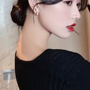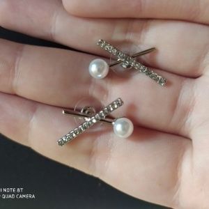 Geometric X Pearl and Diamond Earring Silver Color