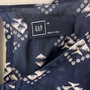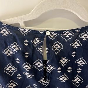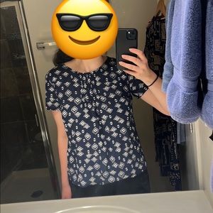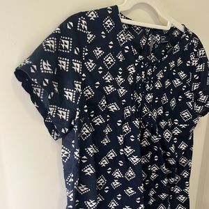 Cute, lightweight blouse - navy blue with a white geometric pattern. Capped sleeves, adorable pleated detail in the front, with a button clasp in the back.