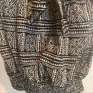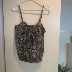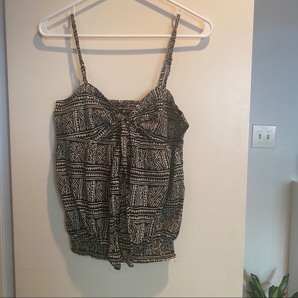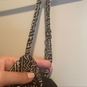 Adjustable straps, front tie, elastic waist that makes it a cropped fit. For smaller chests (A-C ladies) or else the cups may look a little off.