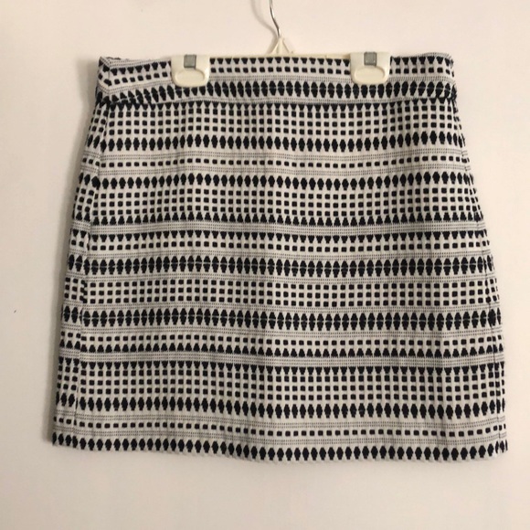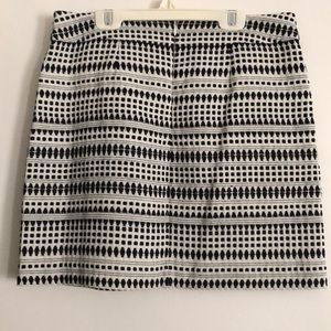 Geometric pattern skirt from Ann Taylor LOFT, size 6P. The skirt is 17.5 inches long. It has one small snag on the waist band. Shell: 60% Cotton, 40% Polyester Lining: 100% Polyester, machine wash cold, Made in Indonesia. Fits true to size.