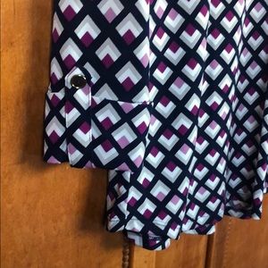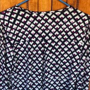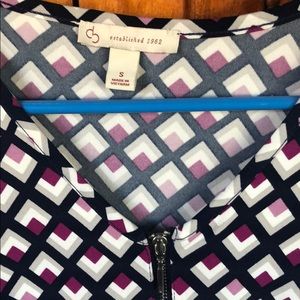 Navy, lavender and purple geometric design. Worn twice. Great w jeans or dress pants!