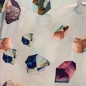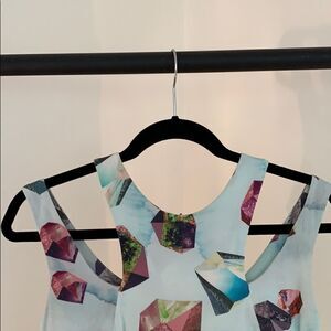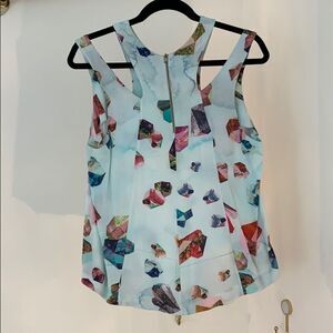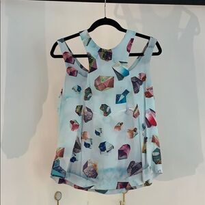 Statement tank top with colorful geometric pattern and distressed background look. Zipper detail in the back, double straps, excellent condition!