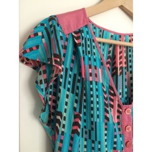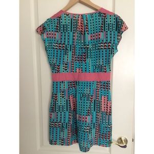 Ultra soft mini dress in geometric pattern with ruffled sleeves. V neckline with signature Juicy button detail. In great condition.