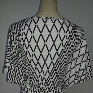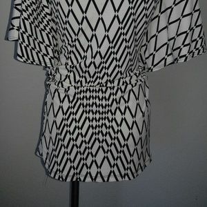 Butterfly sleeve top with elastic waist. Beige with black lines.