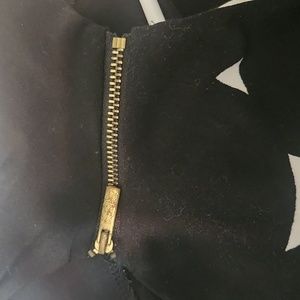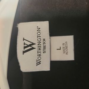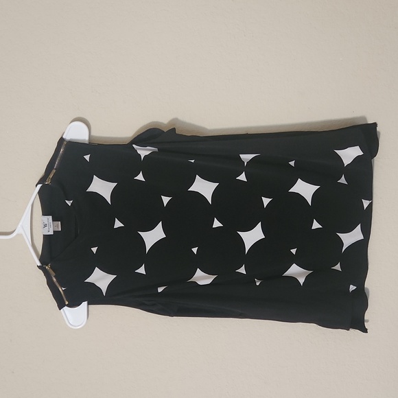 Worthington large geometric top with zippered shoulders. Sleeveless. Black & white. 95% polyester, 5% spandex. Dressy with a hint of funky modern.