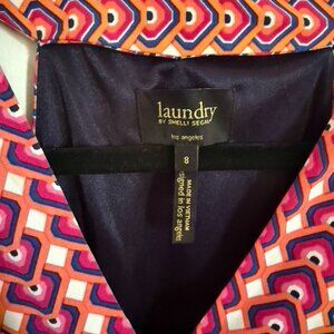 Laundry by Shelli Segal sleeveless dress with a vibrant, multi-colored geometric pattern. It features a twisted or knotted detail at the bust, creating a keyhole neckline. It is an a-line that works perfectly for work, dinner or a wedding!