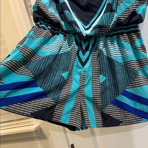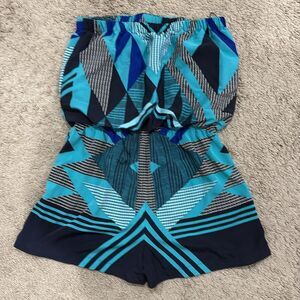 Stylish dress with a bold geometric pattern Romper. Features shades of blue and black. Length is 24.5in. Size medium. Express