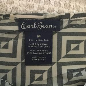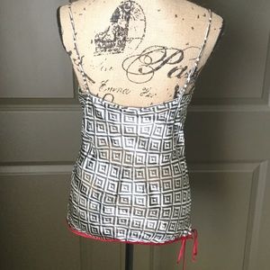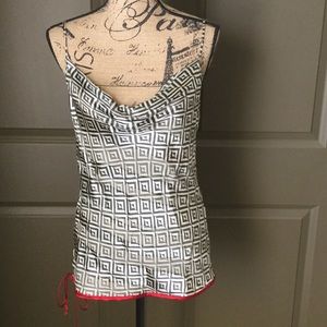 Geometrical pattern tank with small weighted cow neck line. Hemline accident end with red which allows tank to hang straight or can cinch at bottom. 45% silk, 55% rayon.