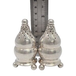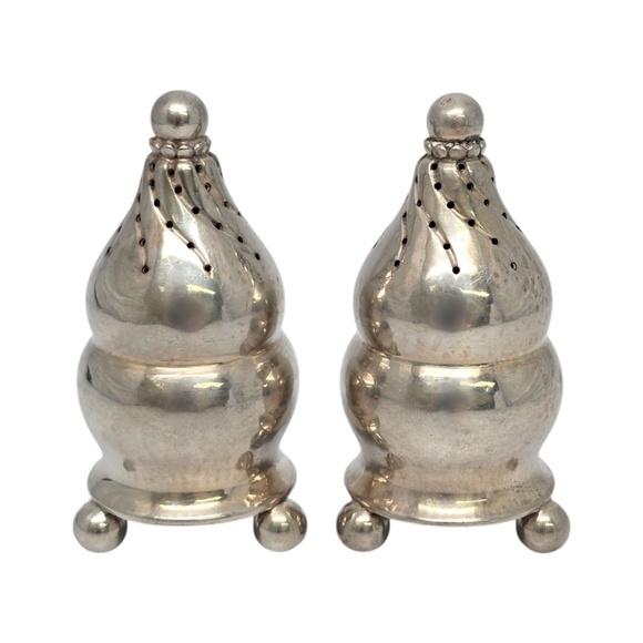 These shakers are bulbus in shape atop 3 ball feet, with a twist design at top. Hallmarks date these to circa 1915-1930.