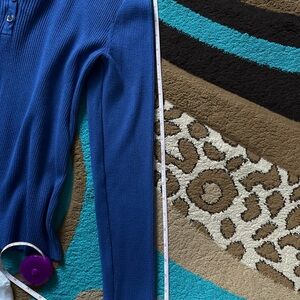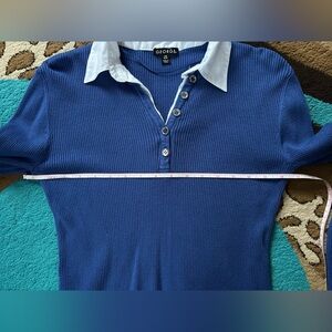 Stylish blue ribbed shirt with button-down front. Features a classic white collar. Perfect for versatile wear.