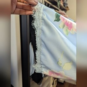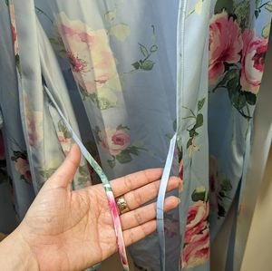 blue robe with pink flower pattern.