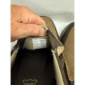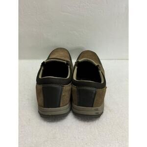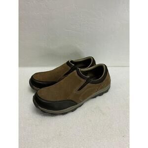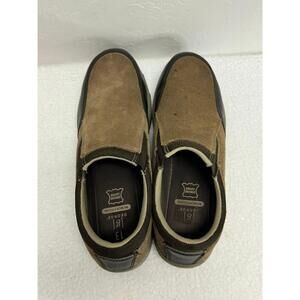 Features: Brown suede, Black trim, Slip-on style, Rugged design